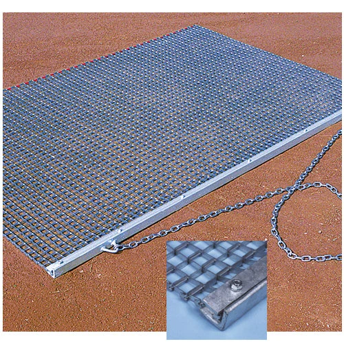 Prepare baseball fields for the beginning of the season and maintain the field as the season progresses with this 6’6″ x 4′ Heavy-Duty Drag Mat. This mat is designed to be attached and pulled behind a tractor to drag and groom the infield dirt to a smooth, even finish, eliminating the need for performing tedious field maintenance by hand. Use this mat before and after games, or even during games, to ensure the dirt is in ideal playing condition. The mat is constructed from galvanized steel mesh with a heavy-duty angle iron bar for effective drag performance.