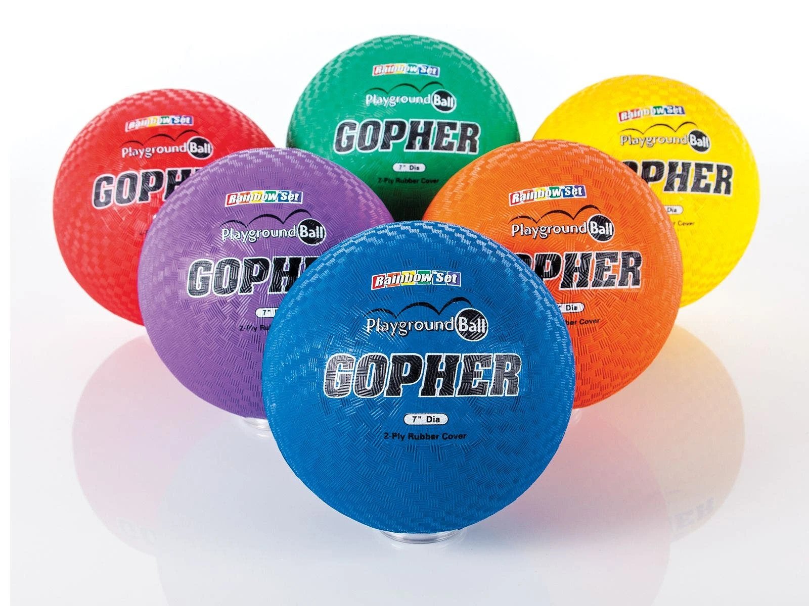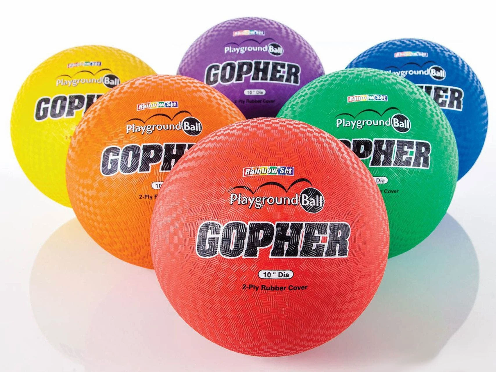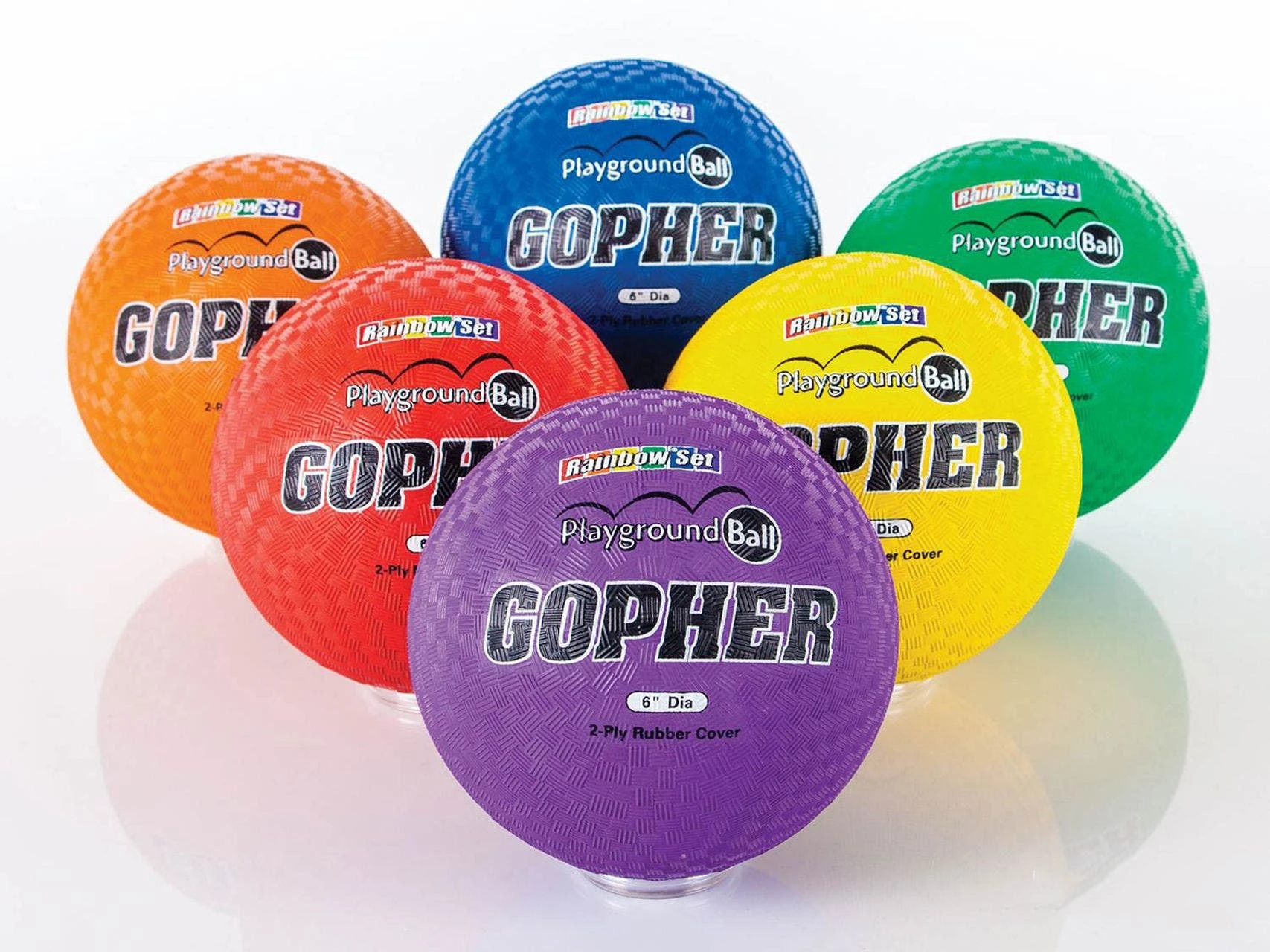 Rainbow Playground Balls are available in Rainbow Sets of 6 in 4 sizes or Individually in 8.5″ dia.