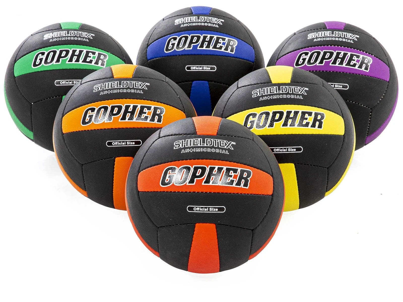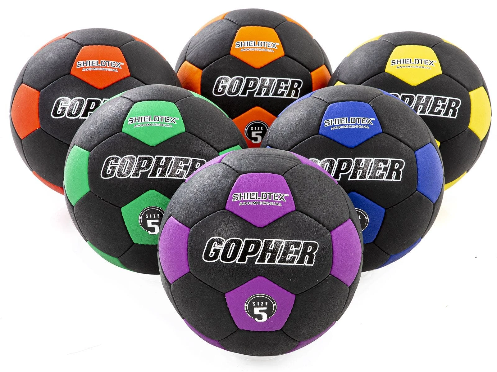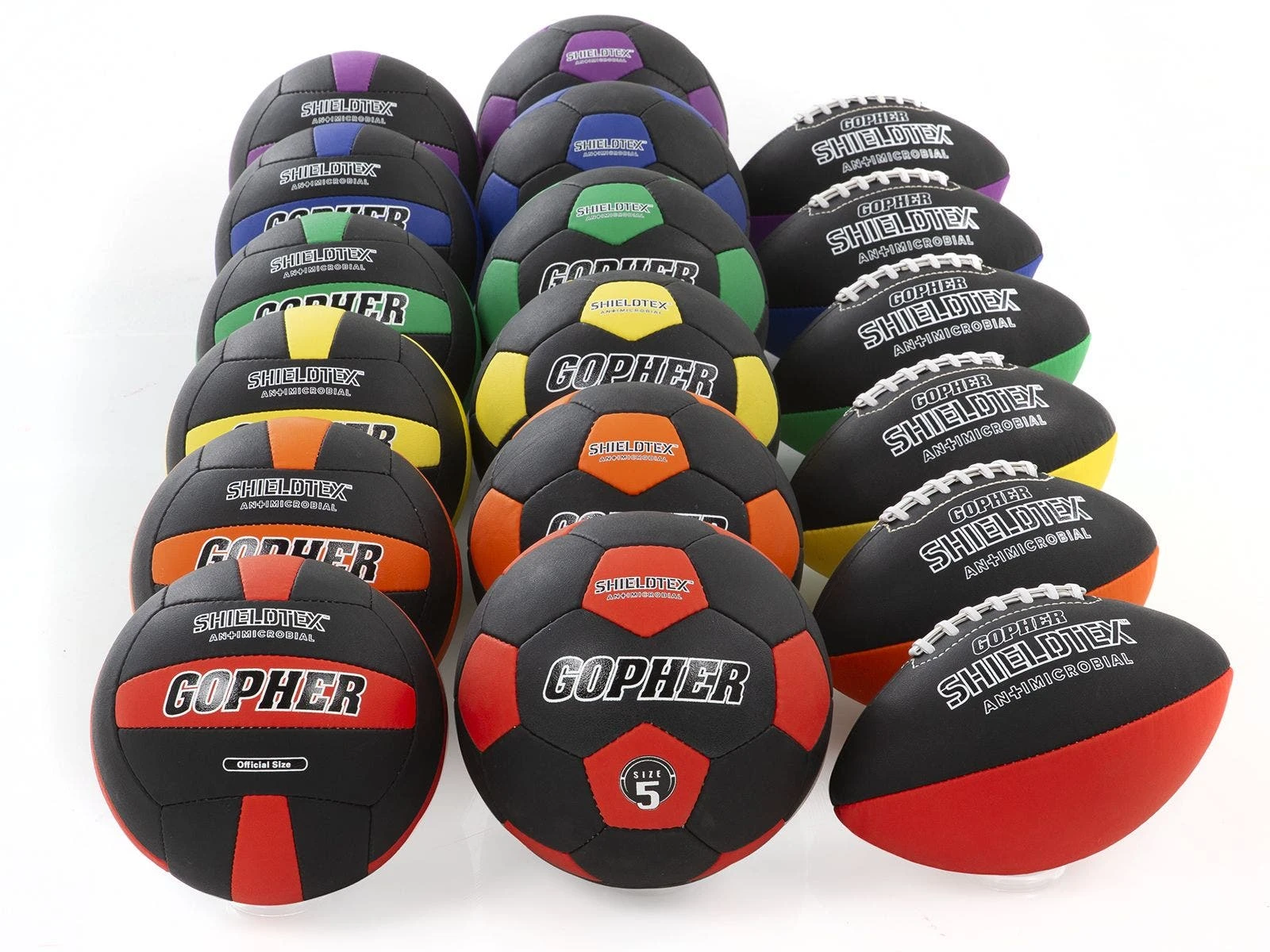Heavy-duty construction and an airlock bladder ensure the balls keep their shape class after class. Balls are available in Rainbow Sets of 6 with a pattern in black and vivid Rainbow colors. Choose from footballs (youth), volleyballs (official size), or soccer balls (size 5).